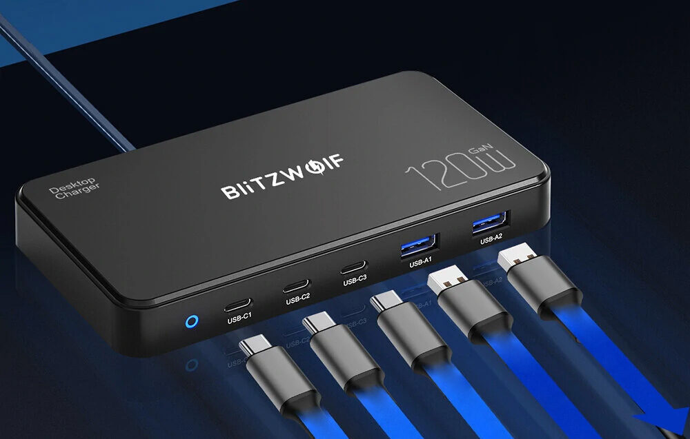 při zapojení maximálně dvou USB-C je schopen poskytnout max 65W na jednom a 45W na druhém, výčet možných režimů napájení zde https://www.blitzwolfeurope.com/shop_ordered/90562/pic/i100/bliztwolf-BW-i100-GaN-120W-desktop-charger-w05.jpg