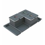 Celý systém jemodulárnía pokud v budoucnu zjistíte, že vám stávající sestava košů nevyhovuje, můžete si dokoupit jiné velikosti košů a vík. Pouze přesunutím děliče vytvoříte v plastové základně prostor pro jiný koš. Všechny koše maji rukojeti, které slouží nejen k manipulaci s košem, ale kupevnění sáčkuna odpad na horním okraji koše.