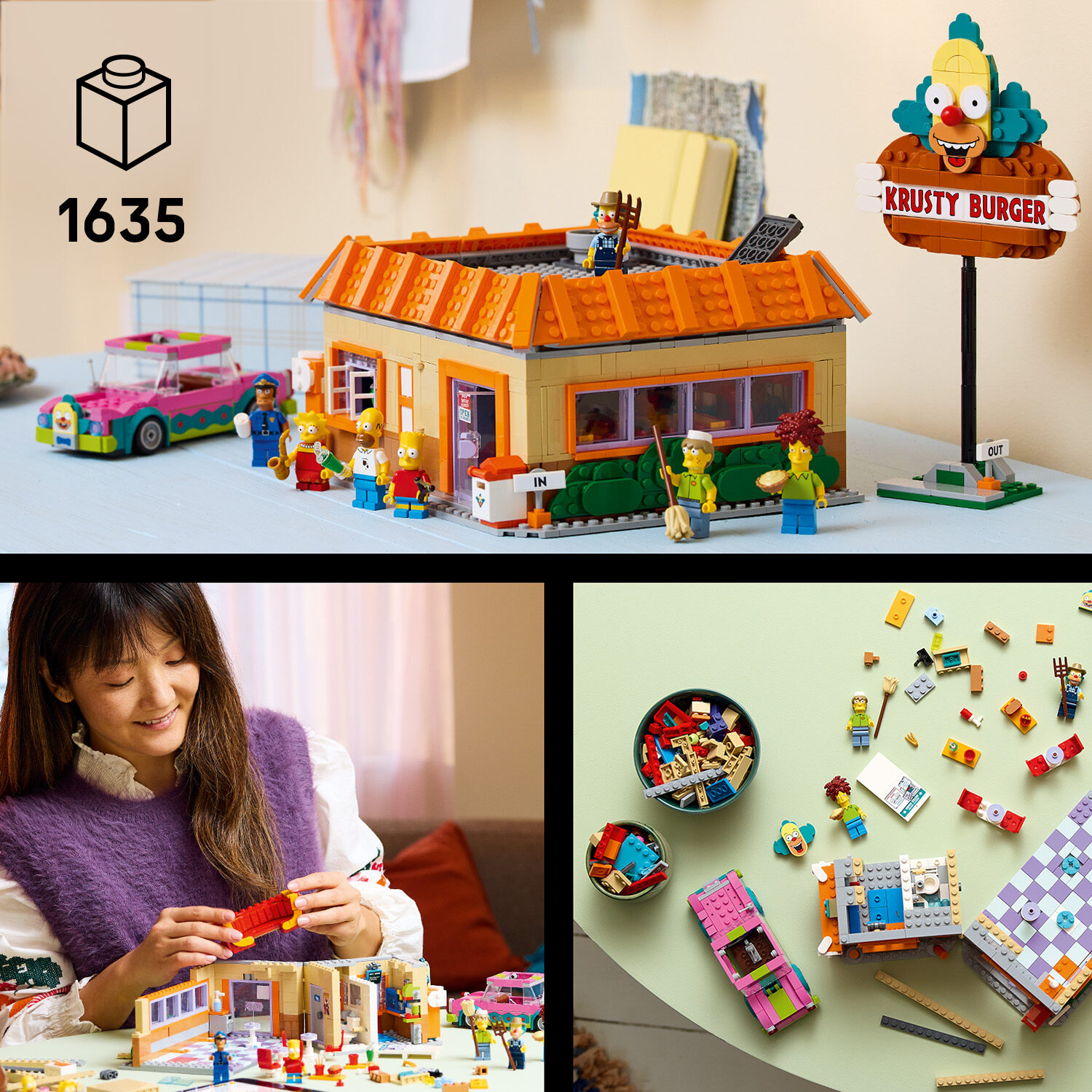 - Co najdete v krabici – Restauraci The Simpsons™: Krusty Burger, ceduli na tyči, Homerovo klaunské auto a minifigurky: Homer, Bart a Lisa Simpson, Farmer Krusty, Sideshow Bob, Squeaky Voiced Teen a Officer Lou