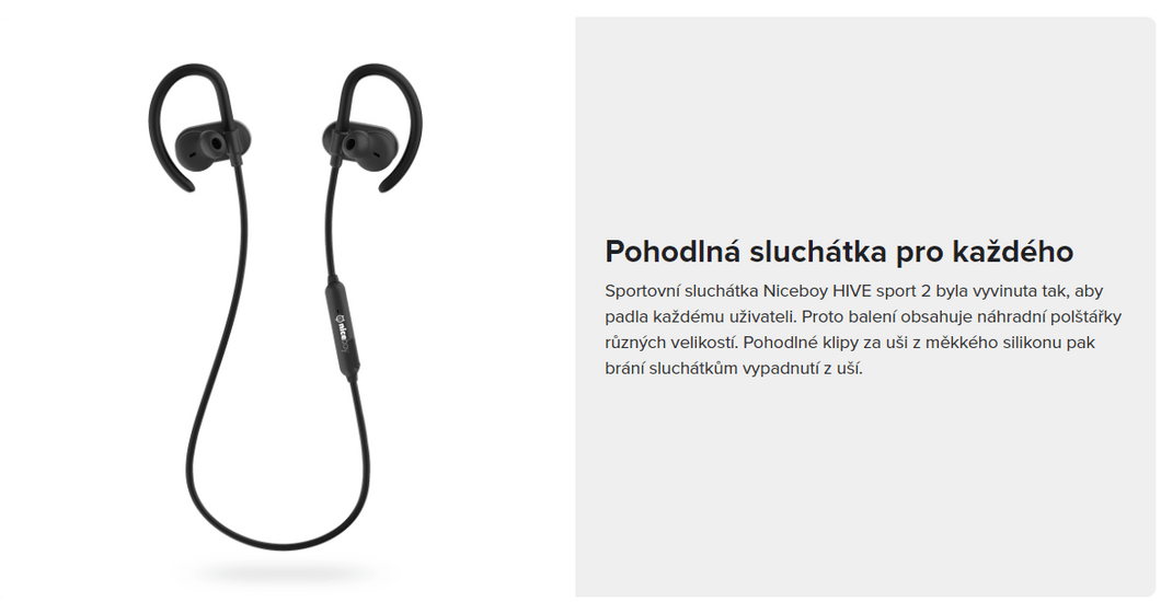 Bezdrátová sluchátka Niceboy HIVE sport 2 Polštářky do uší (2 páry) Nabíjecí microUSB kabel Návod k obsluze |