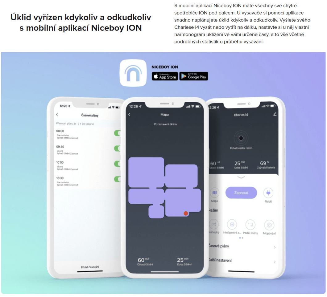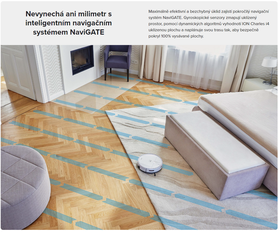 Robotický vysavač Niceboy ION Charles i4 podlahu nejen skvěle vysaje se systémem Hurricane PRO, ale zároveň i vytře díky funkci mopování. S mobilní aplikací Niceboy ION vyřídíte úklid během vteřiny ze svého mobilního telefonu. Vysavač využívá navigační systém NaviGATE pro stoprocentní pokrytí uklízené plochy a s technologií Red SENSE se vyhne kolizím s vaším nábytkem nebo pádu ze schodů. Kapacita baterie vydrží na 100 minut úklidu, před vybitím baterie se robot sám přijede dobít do nabíjecí stanice.