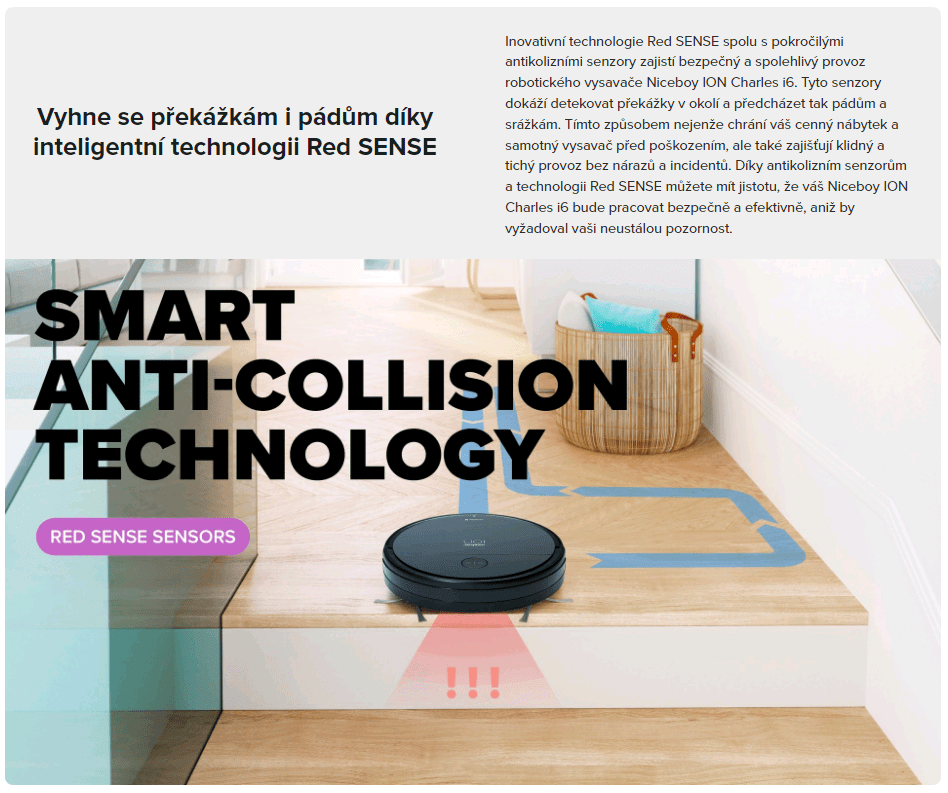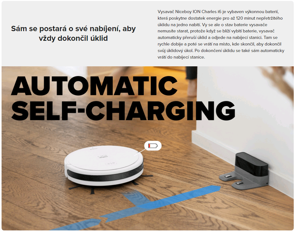 Niceboy ION Charles i6 je inovativním robotickým vysavačem, který se postará o komplexní úklid všech podlah v domácnosti. Podlahy nejenže důkladně vysaje, ale díky funkci mopování také rovnou vytře. Tento vysavač využívá gyroskopický navigační systém pro efektivní plánování tras a jeho chytré senzory zabrání kolizím a pádům. Navíc je vybavený pokročilým filtračním systémem s technologií MAX Clean, která účinně eliminuje veškeré nečistoty i alergeny. Celý úklid navíc odbavíte pohodlně ze svého mobilního telefonu díky propojení vysavače s aplikací Niceboy ION.