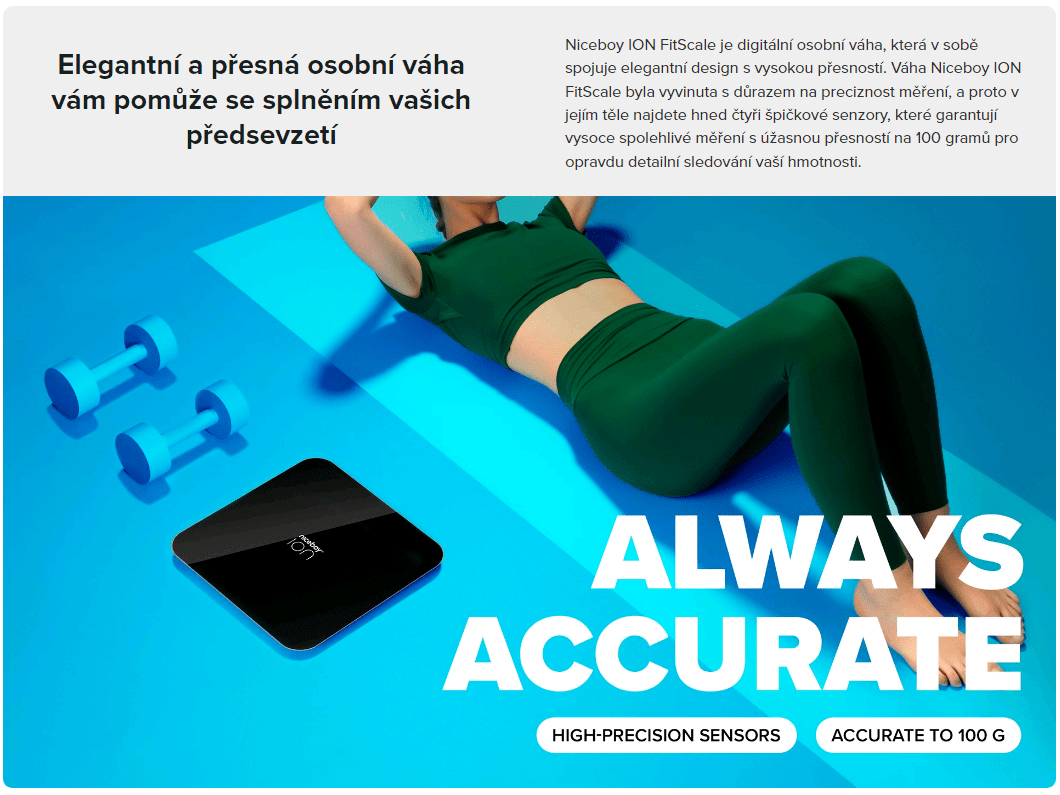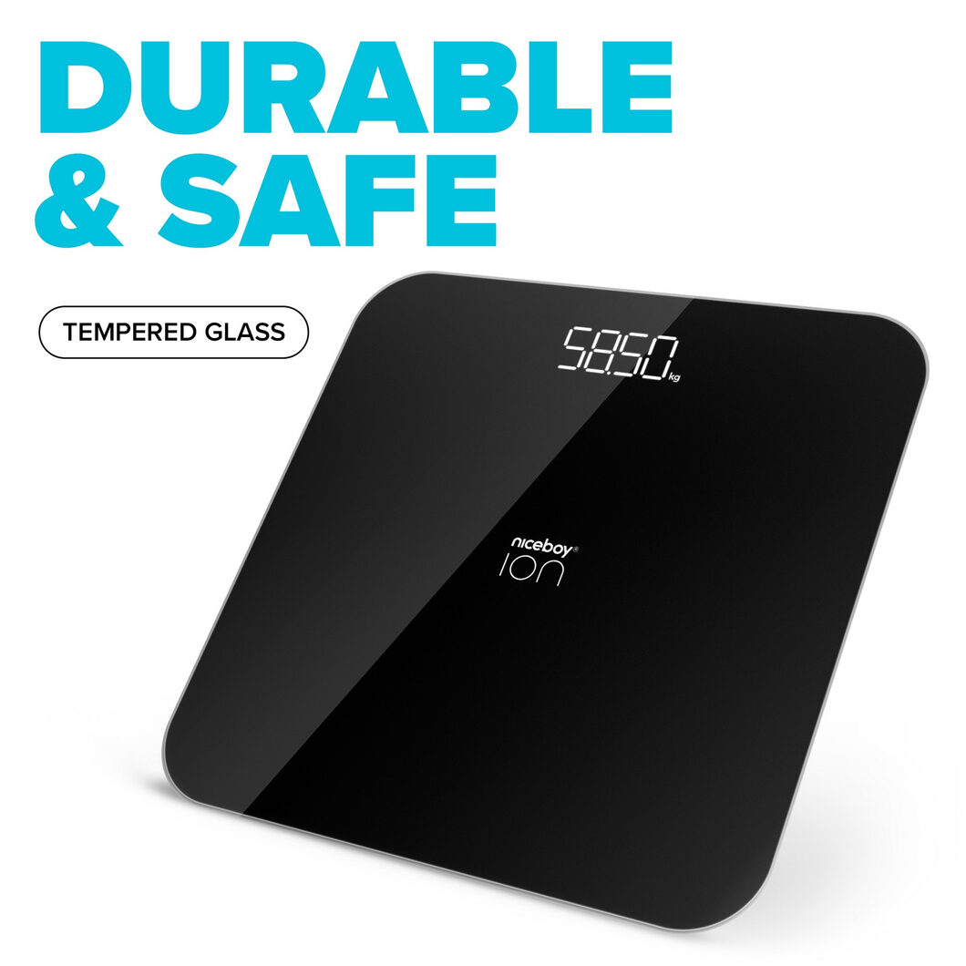 Digitální osobní váha Niceboy ION FitScale v sobě spojuje elegantní design s vysokou precizností díky čtyřem pokročilým senzorům, umožňujícím měření s přesností na 100 gramů. S bytelným zpracováním a horní deskou ze silného tvrzeného bezpečnostního skla dává váze nejen moderní a elegantní vzhled, ale také vysokou odolnost. Velká vážící plocha, zaoblené rohy a protiskluzové silikonové nožičky zajišťují pohodlné a bezpečné používání na každém povrchu.