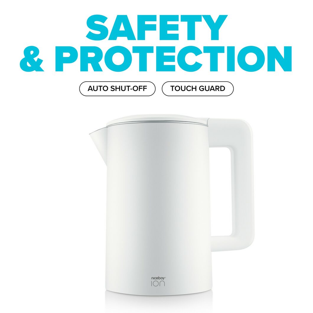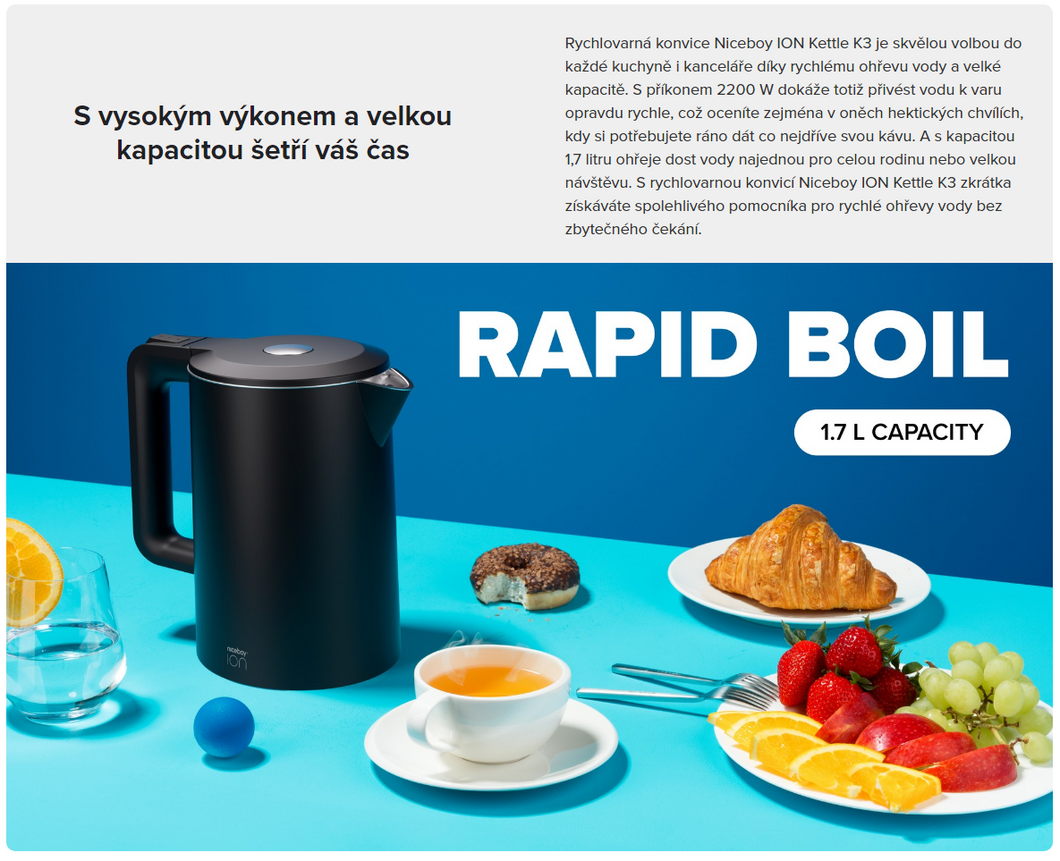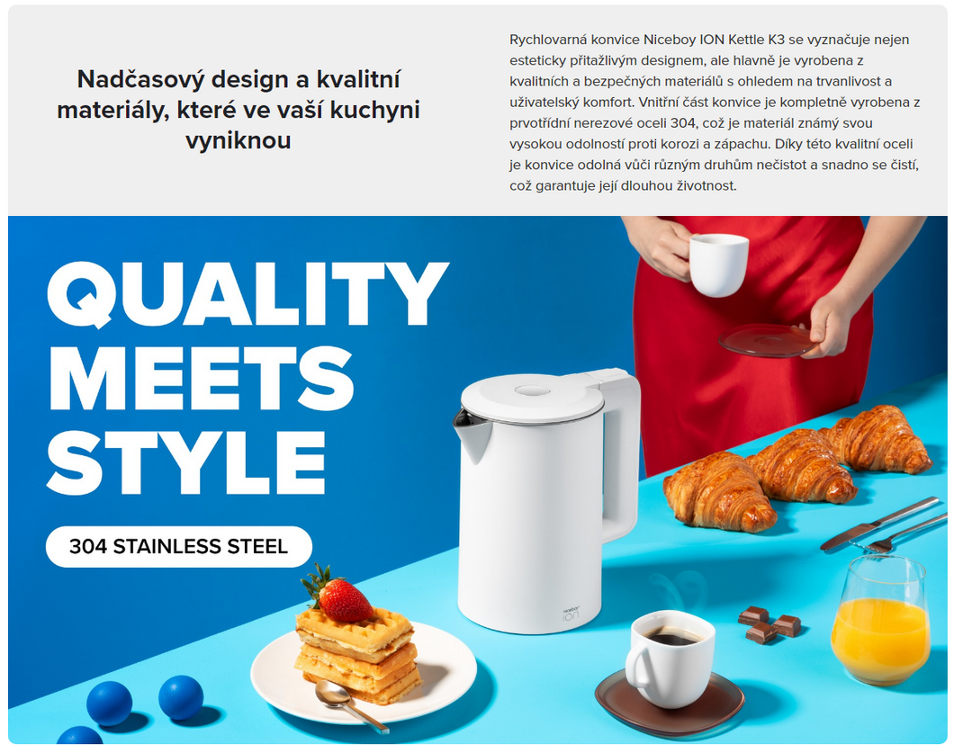 Inovativní rychlovarná konvice Niceboy ION Kettle K3 je propojením elegantního designu, bezpečnosti a vysokého výkonu. Díky příkonu 2200 W dokáže konvice během okamžiku přivést k varu celou kapacitu 1,7 litru, což z ní činí ideální volbu do každé kuchyně. A bezpečnostní prvky, jako je dvojitá stěna s technologií TOUCH Guard a automatické vypnutí při dosažení bodu varu, zajišťují bezstarostné používání.