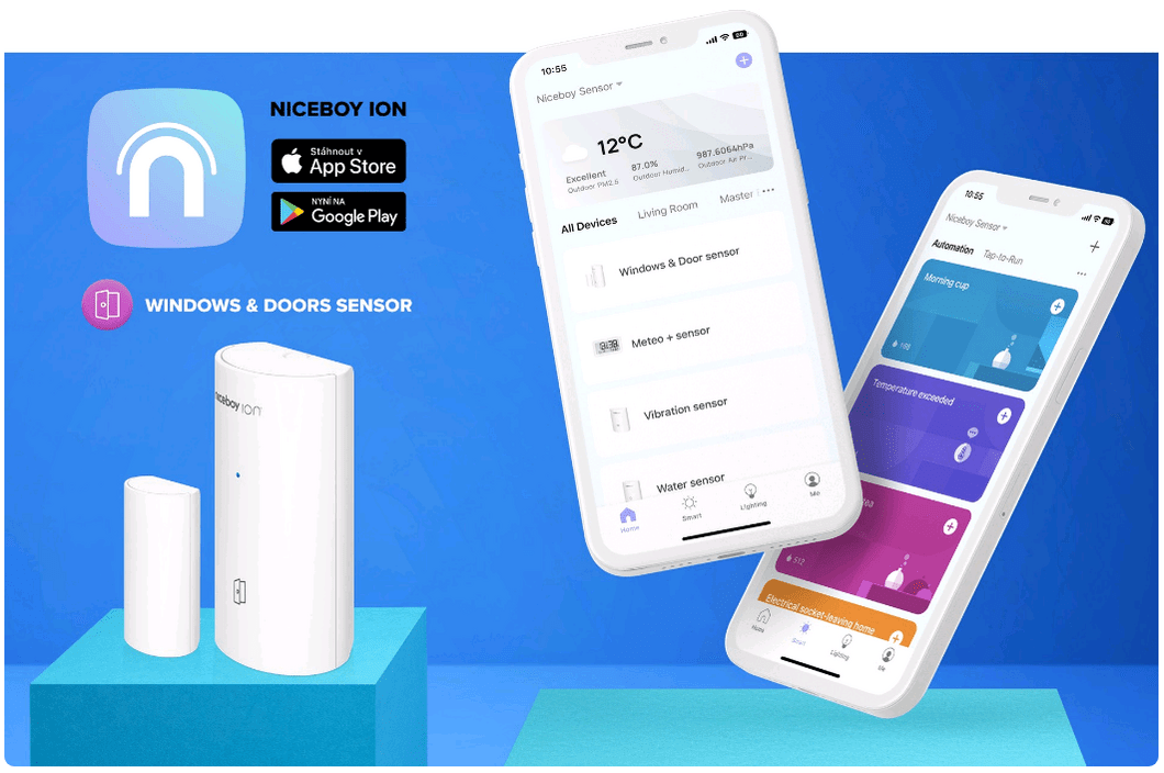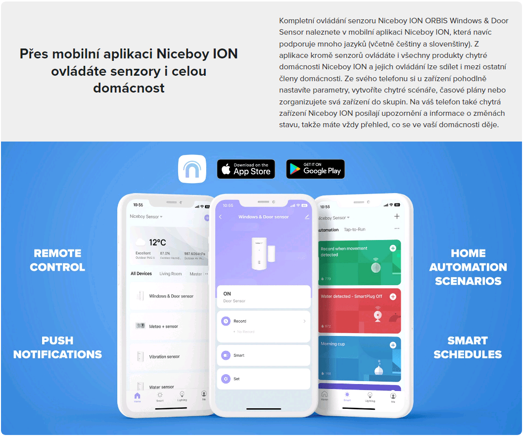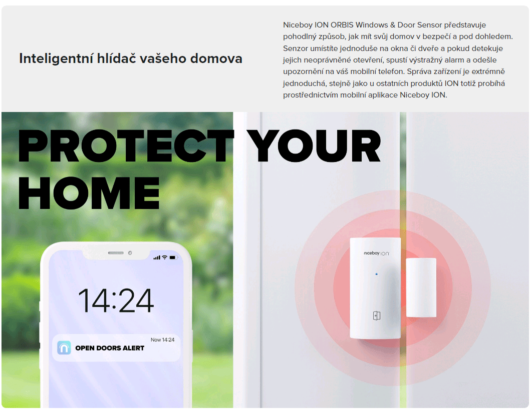 S inteligentním senzorem Niceboy ION ORBIS Windows & Door Sensor na dveře a okna máte bezpečí vašeho domova pod palcem. Pro použití senzoru je nezbytná centrální jednotka Niceboy ION ORBIS Bridge. Po připojení pak můžete v mobilní aplikaci Niceboy ION kontrolovat stav dveří i oken, nastavit upozornění při jejich nežádoucím otevření a provádět nastavení scén pro vaši chytrou domácnost, kdy se například po vašem příchodu a otevření dveří rozsvítí světla v domácnosti.