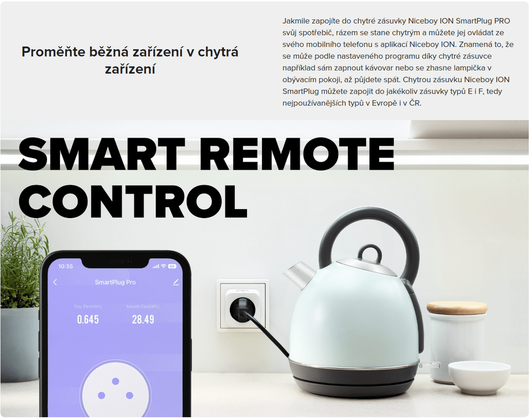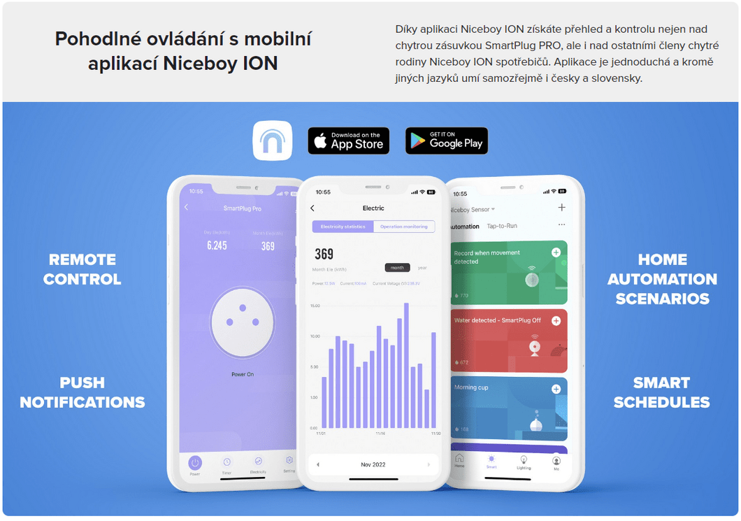 Mějte pod kontrolou provoz svých spotřebičů i výdaje za jejich spotřebu. Chytrá zásuvka Niceboy ION SmartPlug PRO totiž umí změřit vaši spotřebu energie a vy si můžete naplánovat, kdy zásuvka zapne či vypne spotřebič tak, abyste ušetřili. Má bezdrátové připojení přes WiFi a ovládat se dá jednoduše v mobilní aplikaci Niceboy ION, která je samozřejmě i v češtině a dalších jazycích.