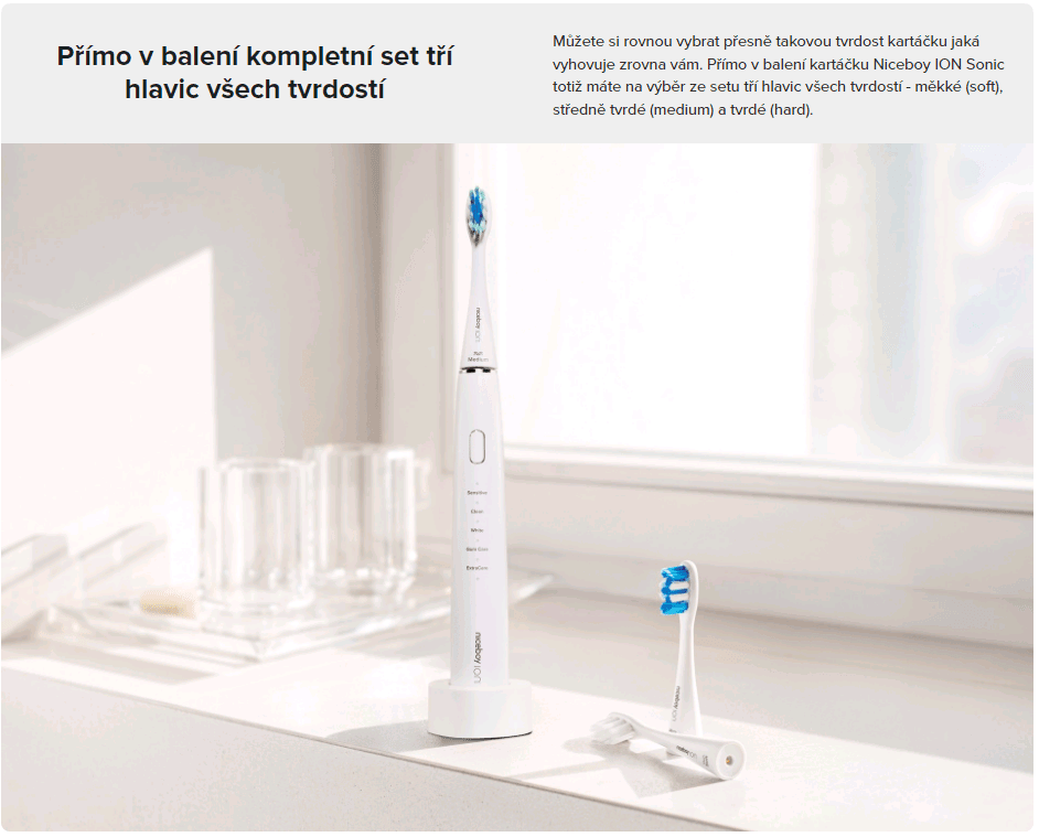 Rukojeť zubního kartáčku Niceboy ION Sonic 3x kartáčková hlavice (měkká, střední, tvrdá) Bezdrátová dokovací stanice Nabíjecí kabel MicroUSB |