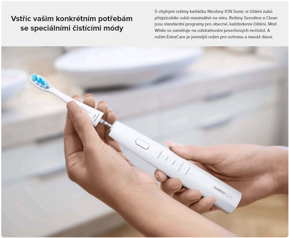 Speciálně tvarovaná hlavice pro komplexní péčiHlavice kartáčku byla navržena tak, aby věrně kopírovala tvar zubů a linii dásní. Niceboy ION Sonic s hustě osázenými, vysoce kvalitními štětinami od předního výrobce DuPont efektivně odstraňuje povrchové nečistoty a vyčistí i těžko přístupná místa v ústech. Velmi záhy tak zuby získávají na přirozené bělosti. |