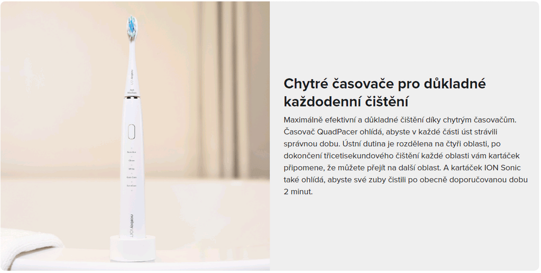 Vysokofrekvenční kartáček Niceboy ION Sonic využívající až 45 000 kmitů za minutu se efektivně postará o váš zářivě bílý úsměv. Jelikož má každý trochu jiné zuby i požadavky na čištění, nabízí Sonic hned několik režimů čištění. K dokonalému vyčištění zubů budou Sonicu stačit 2 minuty, tedy 30 vteřin na každý oblouk. Na změnu oblouku vás vždy upozorní vibracemi, takže není potřeba nic hlídat a sledovat – kartáček to udělá za vás. Niceboy ION Sonic vydrží na jedno nabití až neuvěřitelných 60 dní.