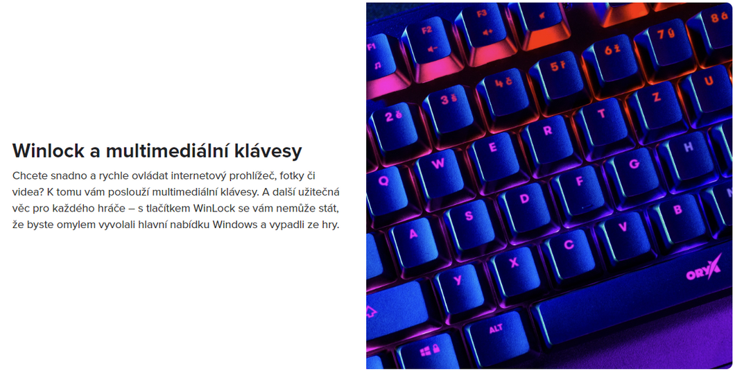 | Výbava klávesnice: | podsvícené klávesy multimediální klávesy mechanické spínače programovatelné klávesy dynamické podsvícení regulace jasu podsvícení mechanická klávesnice software ORYX nastavitelné podsvícení |