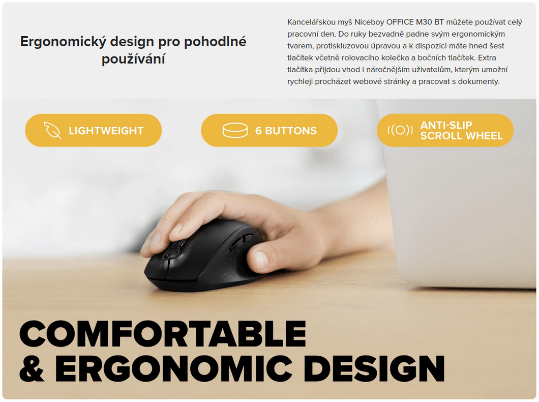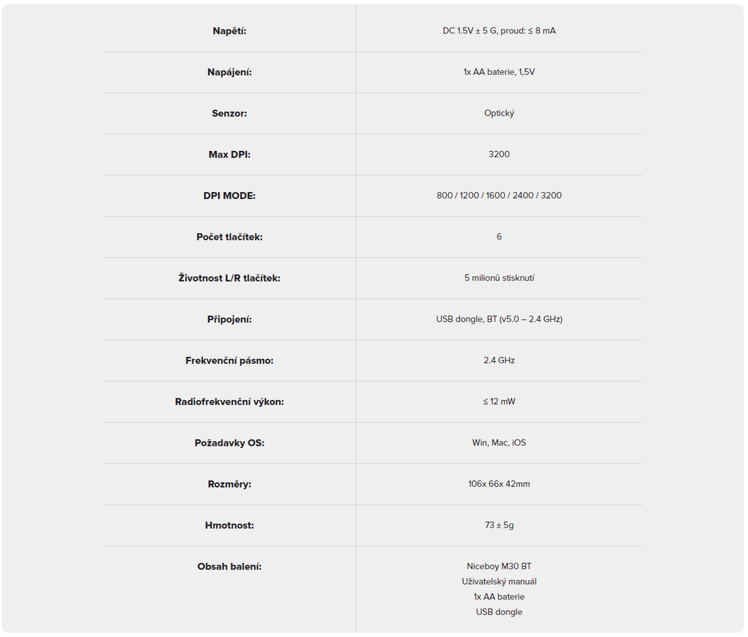 | Svým designem je herní myš Niceboy OFFICE M30 BT určena pro praváky. | K provozu potřebuje myš Niceboy OFFICE M30 BT jednu AA baterii, která je součástí balení. | Pro úsporu energie přejde myš po 10 minutách nečinnosti do režimu spánku, probudí se pohybem. |