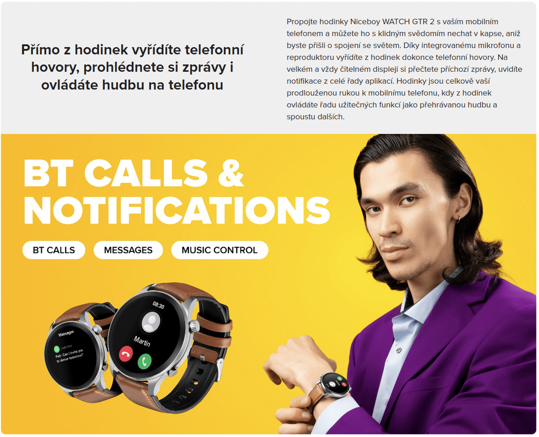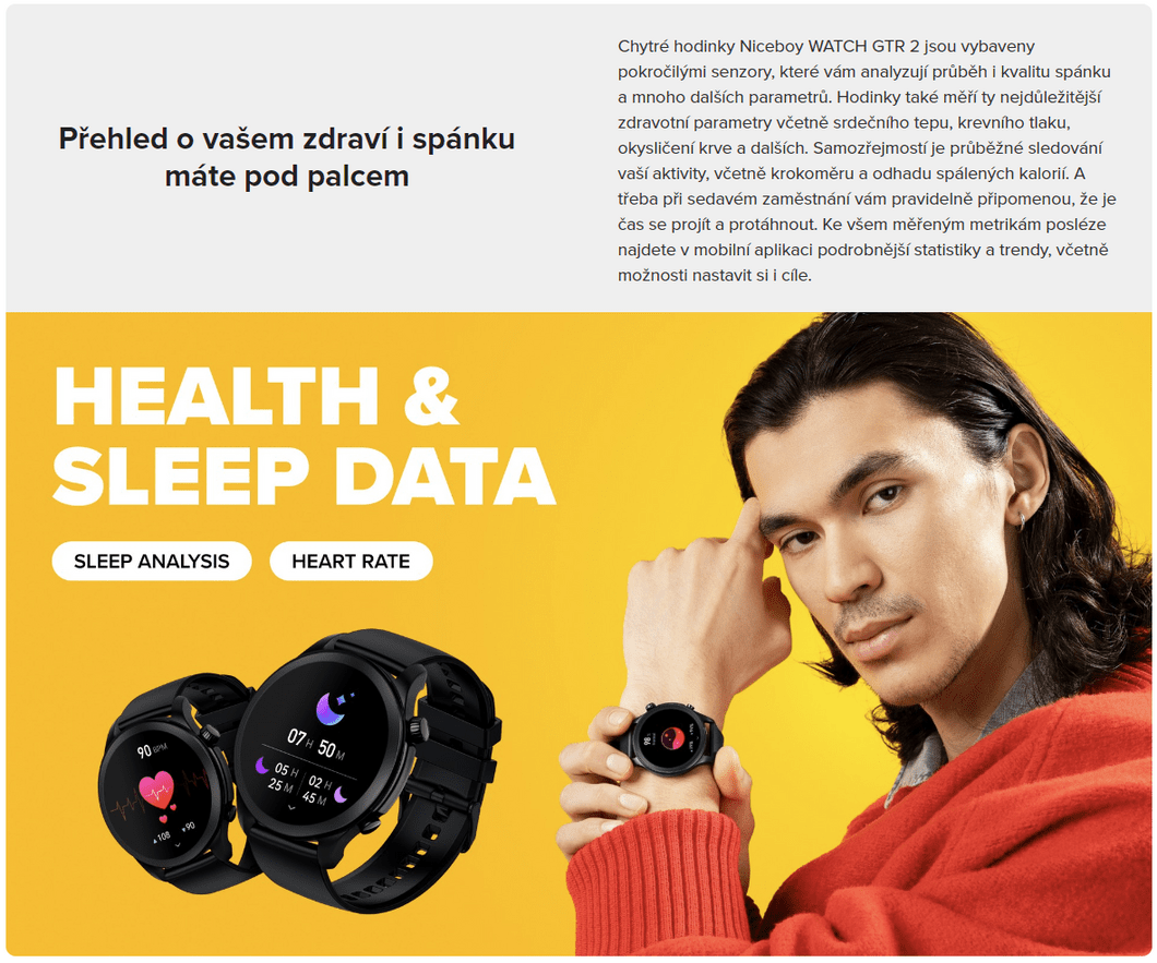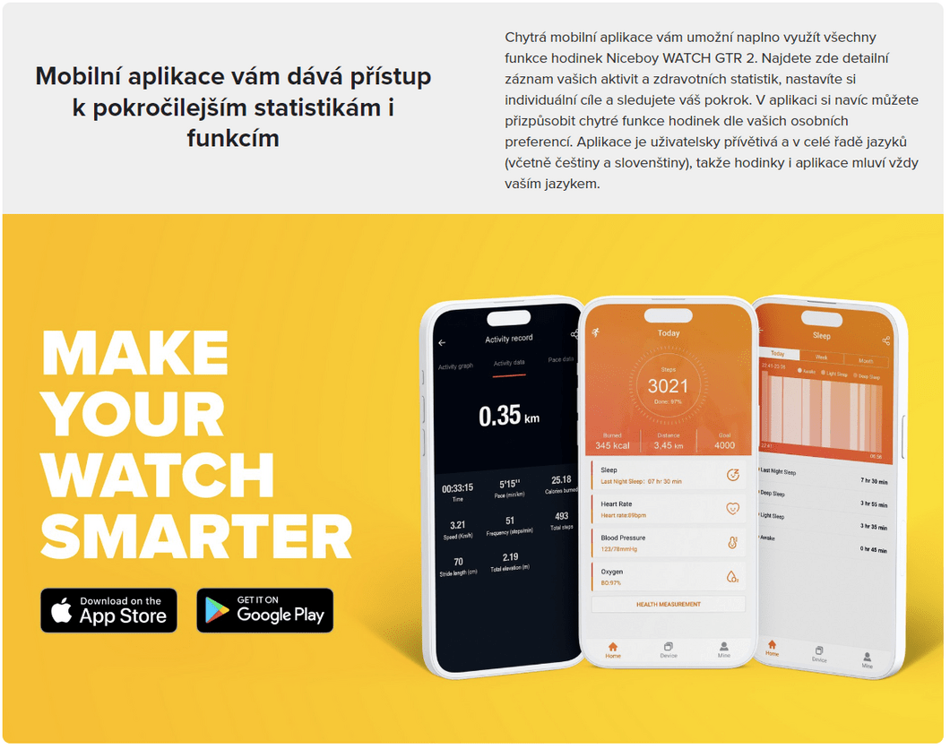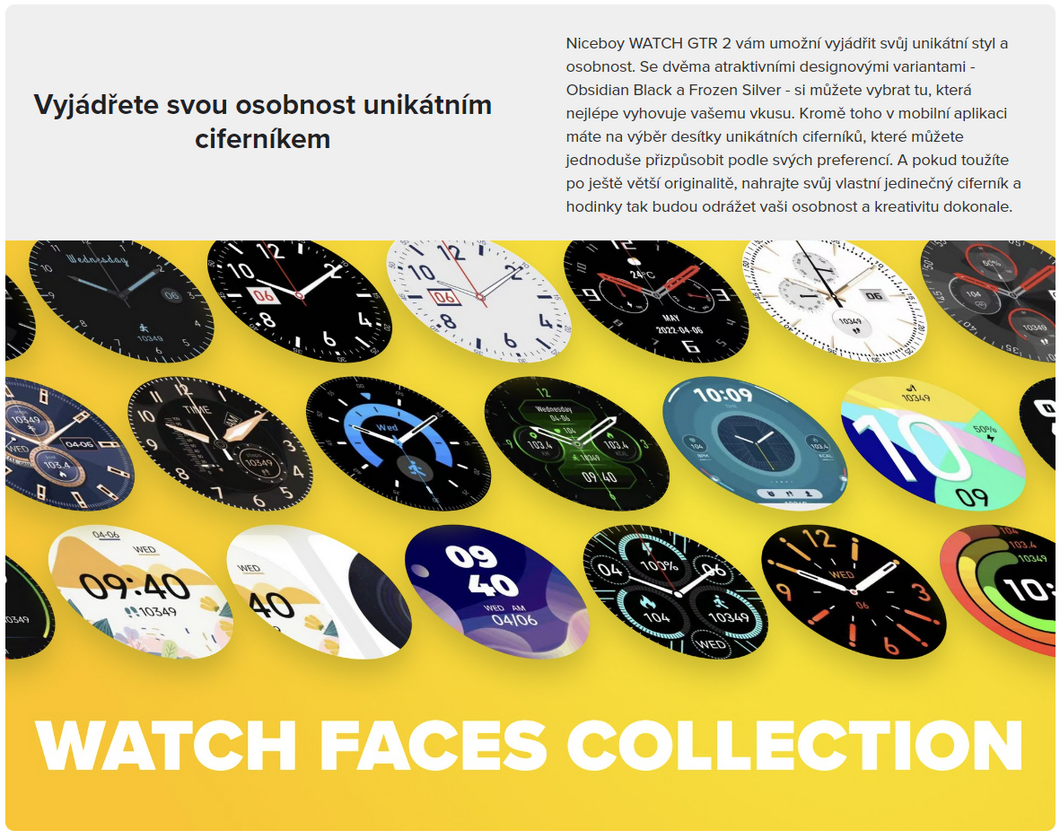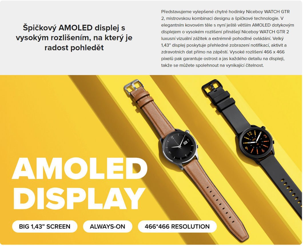 | Používání hodinek i aplikace je jednoduché, protože je možné nastavit si vedle angličtiny další jazyky (včetně češtiny nebo slovenštiny). | Díky této funkci ukazuje displej chytrých hodinek neustále čas, ale s minimální spotřebou baterie. | U hodinek Niceboy WATCH GTR 2 si snadno vyměníte řemínek díky rychloupínací sponě o šířce 22 mm. |