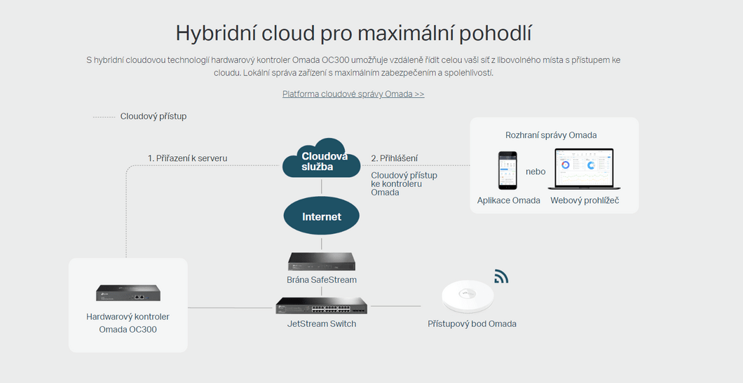 - Centralizovaná správa až 500 přístupových bodů Omada, 100 switchů JetStream a 100 routerů SafeStream.