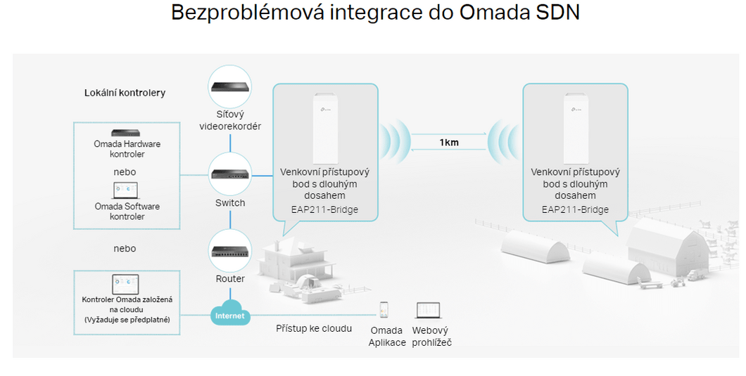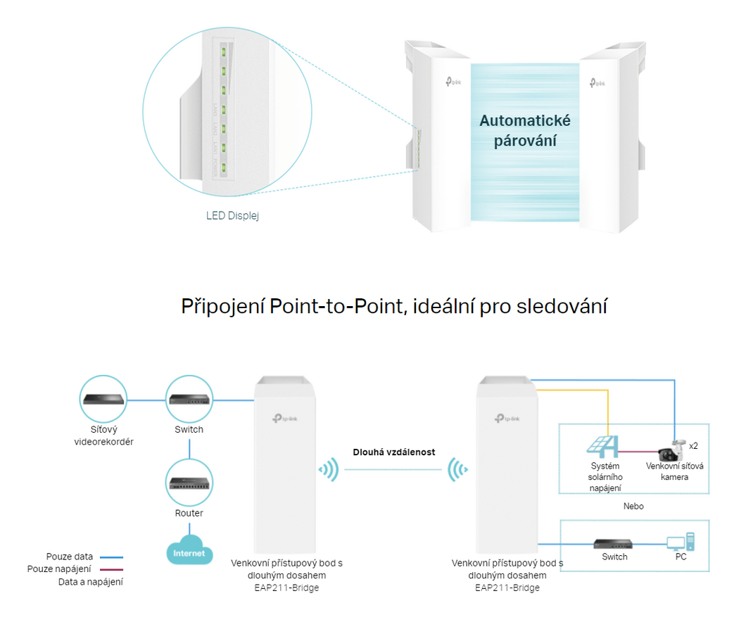 TP-Link Omada EAP-211 Bridge Kit je spolehlivé zařízení určené pro venkovní použití, proto nepřekvapí voděodolné provedení. Nevadí mu tedy vlhkost nebo déšť. Upozornění - voděodolné neznamená vodotěsné! Jedná se o multifunkční zařízení, kdy jediným tlačítkem můžete snadno přepínat mezi síťovými módy. Přehled jeho funkcí si můžete přečíst níže. TP-Link Omada EAP-211 Bridge Kit tedy můžeme doporučit pro: