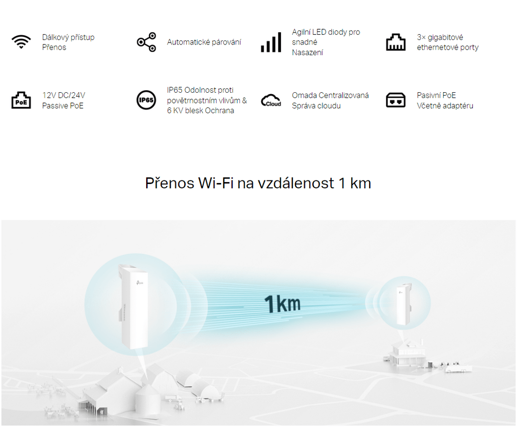 - Podporuje pasivní PoE pro flexibilní nasazení (adaptér je součástí dodávky).