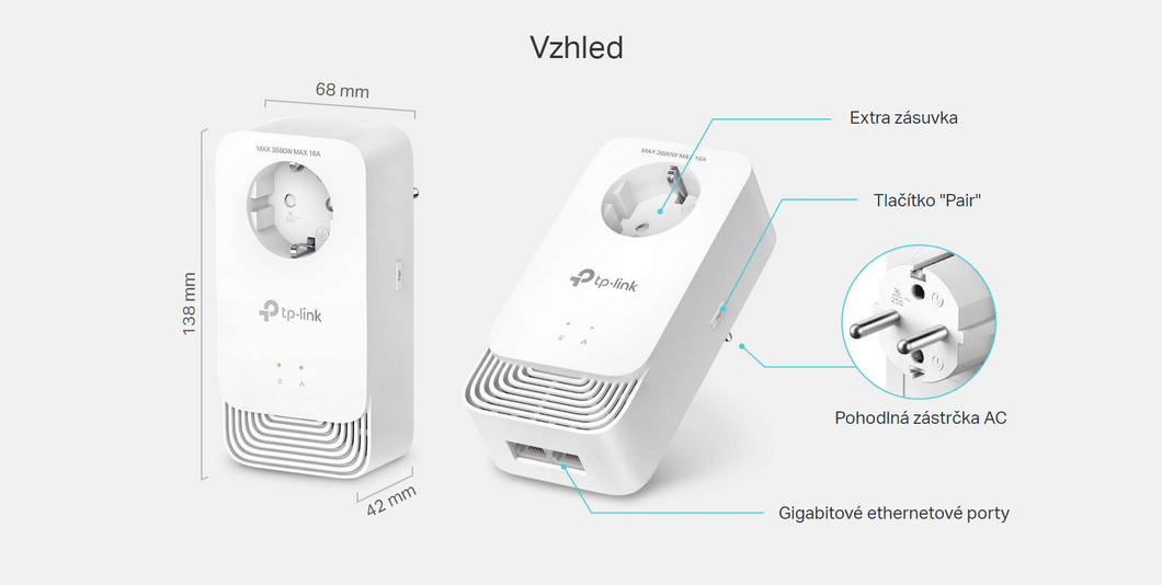 ‡Maximální rychlosti signálu Powerline jsou fyzické rychlosti odvozené ze specifikací G.hn. Skutečná datová propustnost Powerline a dosah Powerline nejsou zaručeny a budou se lišit v důsledku podmínek sítě a faktorů prostředí, včetně elektrického rušení, objemu provozu a režie sítě, jističe AFCI a umístění Powerline v samostatném obvodu.