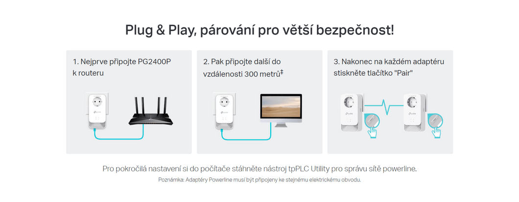 - Plug & Play pro pokrytí celé domácnosti - Až 300 m po stávajícím elektrickém vedení.‡