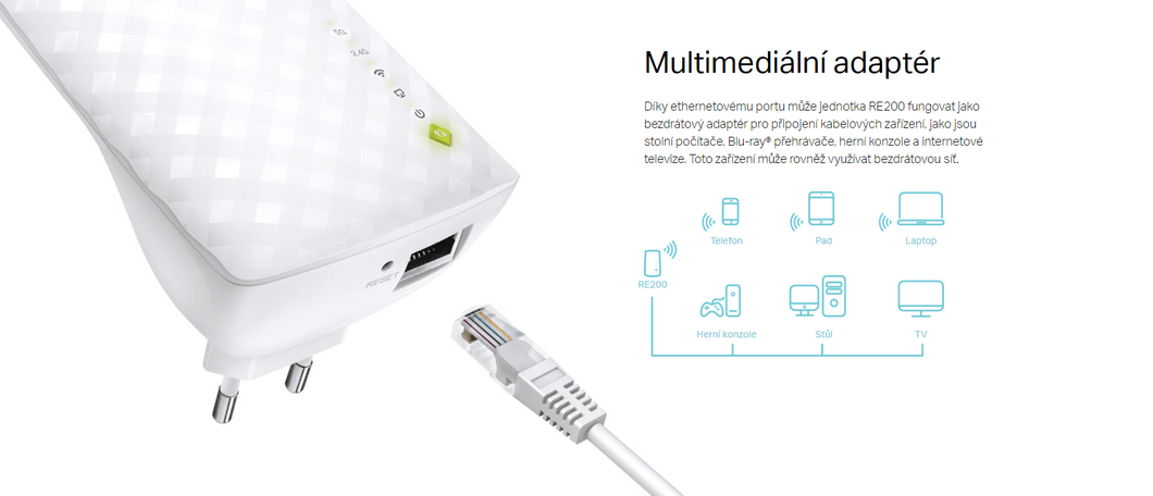 - Díky ethernetovému portu může extender fungovat jako bezdrátový adaptér, ke kterému lze připojit kabelová zařízení