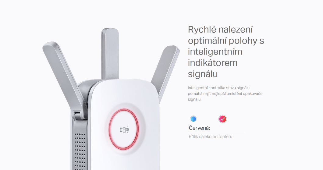Velikost pokrytí Wi-Fi signálem závisí na vysílacích anténách - typu, počtu a zejména jejich zisku. Tyto parametry pak společně s počtem a typem překážek (např. zdivem) ovlivňují dosah signálu. Proto je doporučeno situovat vysílací zařízení do středu prostoru, který chceme bezdrátovým signálem pokrýt. Se zařízením TP-LINK RE450 se ovšem ničeho obávat nemusíme, protože disponuje 3x externí anténou se ziskem 3x 3 dBi. Můžete se tak spolehnout na bezproblémový provoz Wi-Fi.