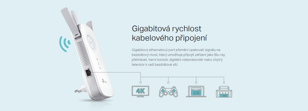 TP-LINK RE450 má ve své portové výbavě drátové připojení o maximální rychlosti dat až 1 Gbps (jeden gigabit za vteřinu). Port(y) jsou zpětně kompatibilní i s nižšími rychlostmi 10/100 Mbps. Právě díky gigabitovému rozhraní TP-LINK RE450 perfektně zapadne do vaší sítě, přičemž těšit vás budou zejména bleskově rychlé řenosy dat.
