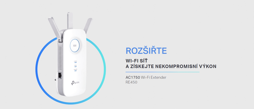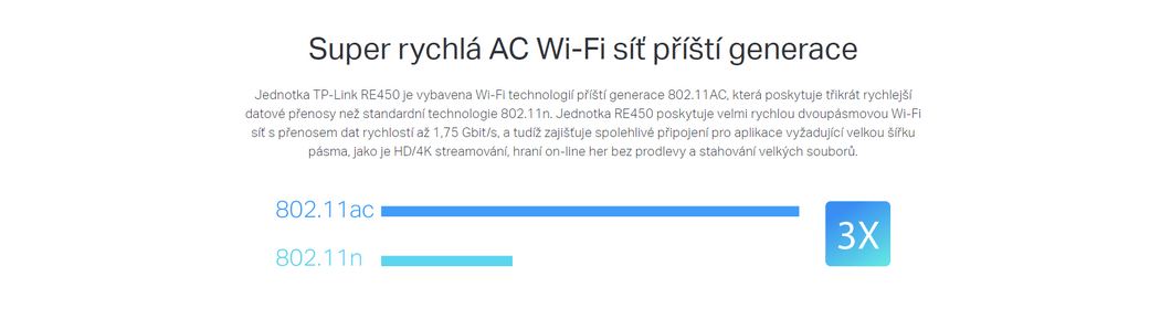 TP-LINK RE450 disponuje Wi-Fi rozhraním s podporou standardu 802.11a/b/g/n/ac, což umožňuje pokrýt frekvenční pásma 2.4 + 5 GHz. Jde tedy o tzv. Dual-Band provoz, kdy zařízení zvládne pracovat v obou frekvenčních pásmech najednou, aniž by se pásma navzájem omezovala. Právě nejrychlejší standard 802.11ac běží na frekvenci 5 GHz, kde může nabídnout velmi vysokou rychlost. Přesná hodnota rychlosti se odvíjí od počtu a typu bezdrátových antén, avšak gigabitovému síťovému kabelu se stále ještě nevyrovná.