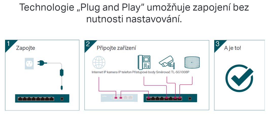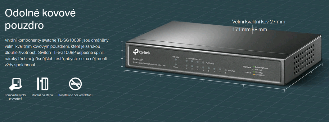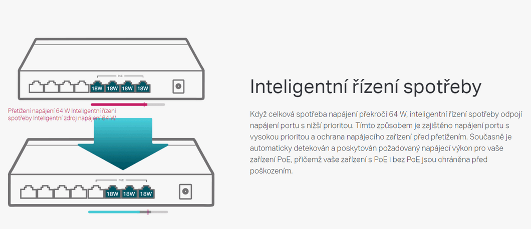 - 4 porty PoE+ přenáší data a napájení v jednotlivých kabelech.