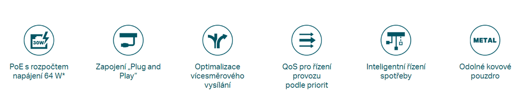 - Podporuje napájení PoE s celkovým výkonem až 64 W ze všech portů PoE.*