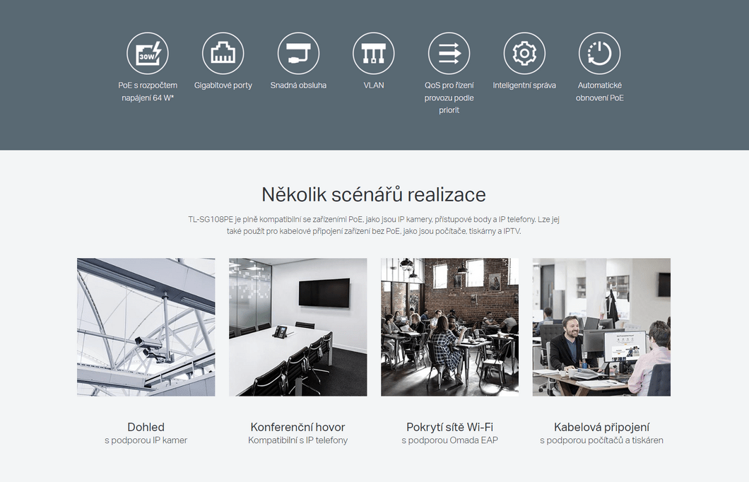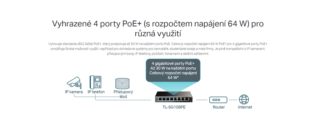 ano Switch od Tp-linku umí nastavovat priority přenosu dat. Switch umožňuje až 30W napájení na každém portu, přičemž celkový napájecí výkon na všech portech nesmí přesáhnout 64 W.