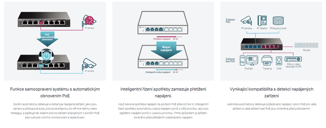 - Poskytuje monitorování sítě, řízení provozu podle priorit, funkce VLAN a automatické obnovení PoE