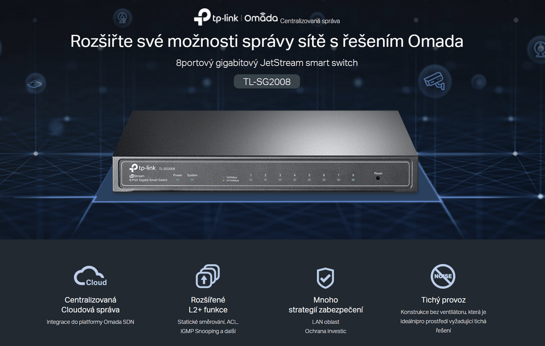Pro střední firmu – Switch TP-LINK TL-SG2008 je určen pro náročnější síťové prostředí středně velkých podniků. Samozřejmostí jsou i pokročilé funkce, které zajisté usnadní, zefektivní, zabezpečí a zrychlí vaši podnikovou síť.
