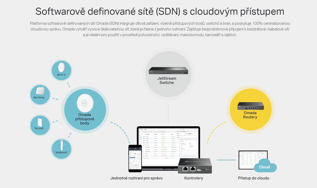 - Integrováno do platformy Omada SDN: funkce ZTP (Zero-Touch Provisioning)*, centralizovaná cloudová správa a inteligentní monitorování.