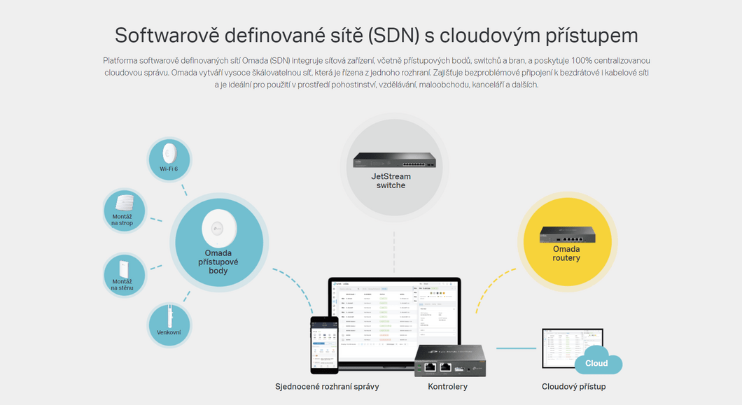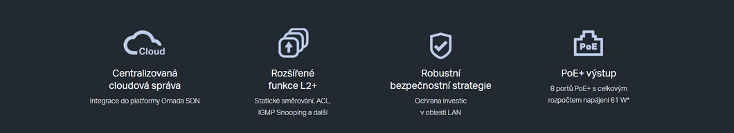 - Integrováno do platformy Omada SDN: Funkce ZTP (Zero-Touch Provisioning)**, centralizovaná cloudová správa a inteligentní monitorování