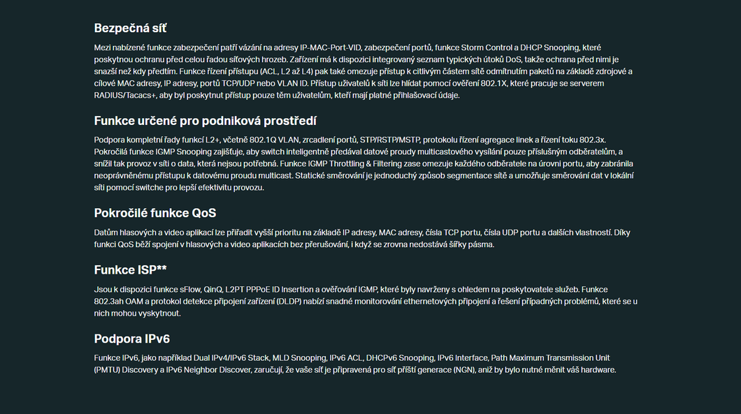 | Funkce | QoS (Quality of Service) , VLAN |