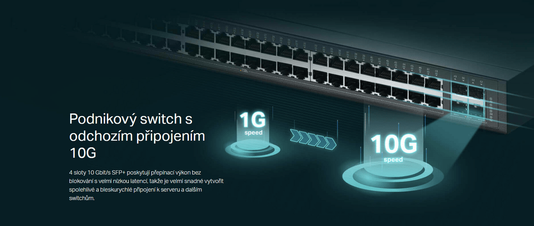 - Bleskurychlé odchozí připojení 10G: 4 sloty SFP+ s rychlostí 10 Gbit/s umožňují vysoce propustné širokopásmové připojení a přepínací kapacitu bez blokování.
