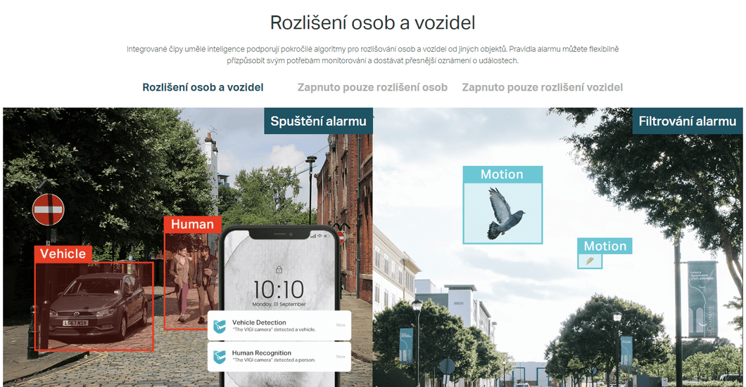 - Rozlišení osob a vozidel: Rozlišuje osoby a vozidla od ostatních objektů, takže dostáváte přesnější oznámení o událostech.