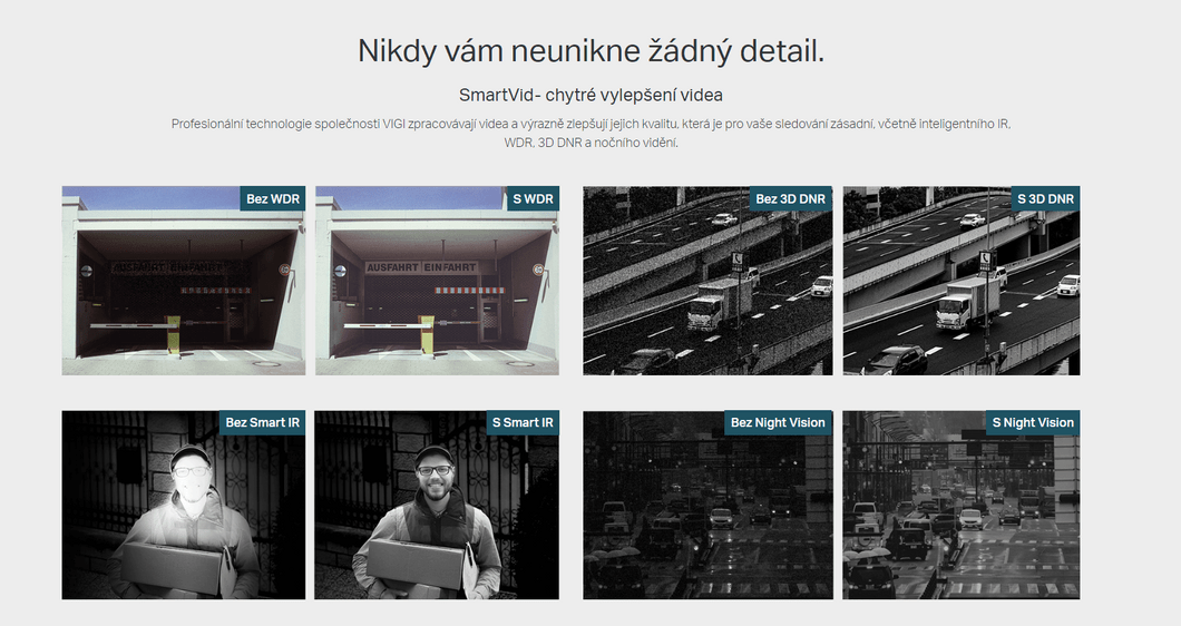 - Chytré vylepšení videa: Profesionální technologie VIGI zpracovávají videa a výrazně zlepšují jejich kvalitu, která je pro vaše sledování zásadní, včetně Smart IR, True WDR, 3D DNR a nočního vidění.