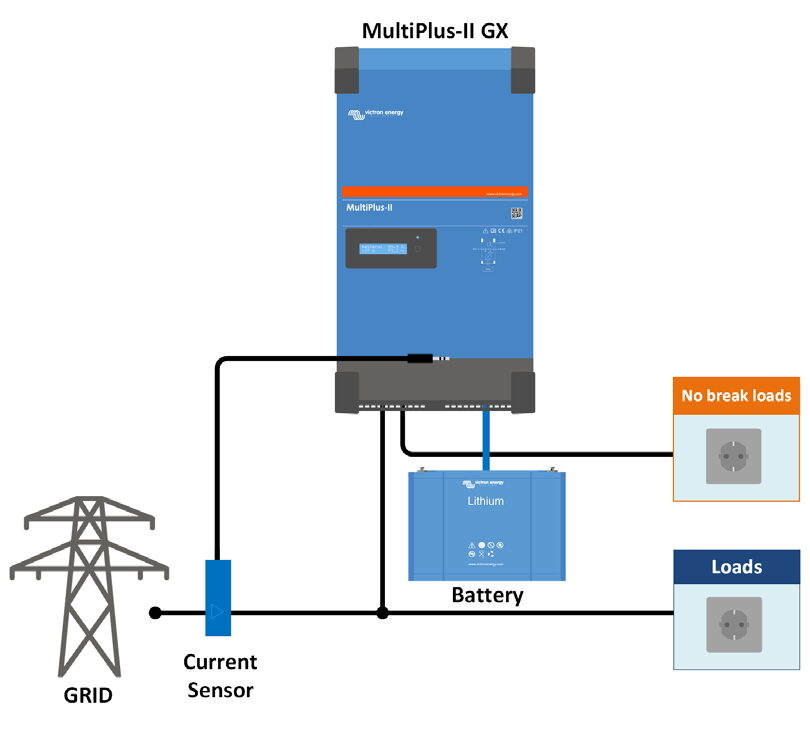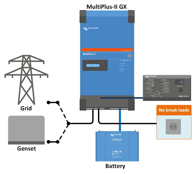 MultiPlus-II GX je vybaven jedním AC vstupem pro připojení distribuční sítě nebo např. generátoru. Pokud jsou potřeba dva AC vstupy, pak zvolíme jednotku Quattro.