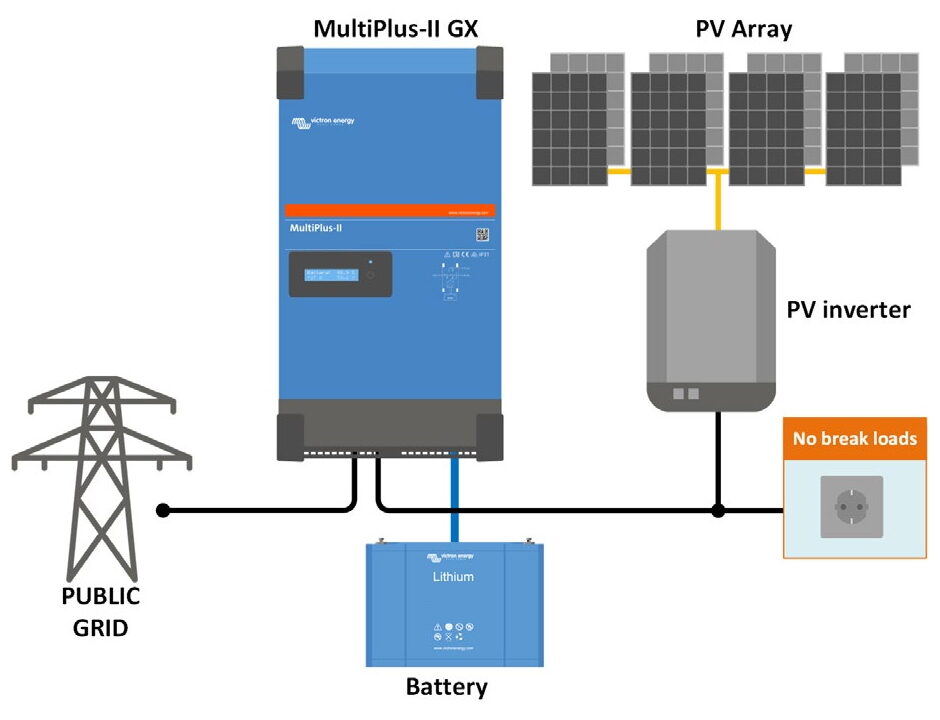 AC proud můžete mít k dispozici i v případě výpadku distribuční sítě. MuliPlus-II GX může být použit jak v off-grid (ostrovních) systémech, tak ve fotovoltaických systémech trvale připojených k distribuční síti. MultiPlus-II není vybaven vstupem pro FV pole, je ale předurčen ke spolupráci s MPPT regulátory (DC coupling systémy) nebo síťovými měniči (AC coupling systémy) umístěnými na AC vstupu a/nebo AC výstupu. Více zde v popisu ESS.
